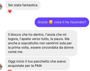 Io stessa nella mia vita, anche dopo l’infertilità, sono quella che sono oggi perché ho trovato donne e sorelle nel mio cammino che mi sostengono nei momenti bui, ma anche nelle gioie, che mi ricordano quanto è sacro il nostro corpo di donne, quanto è importante prendersi cura di noi, portare amore, parole, gesti, rituali.